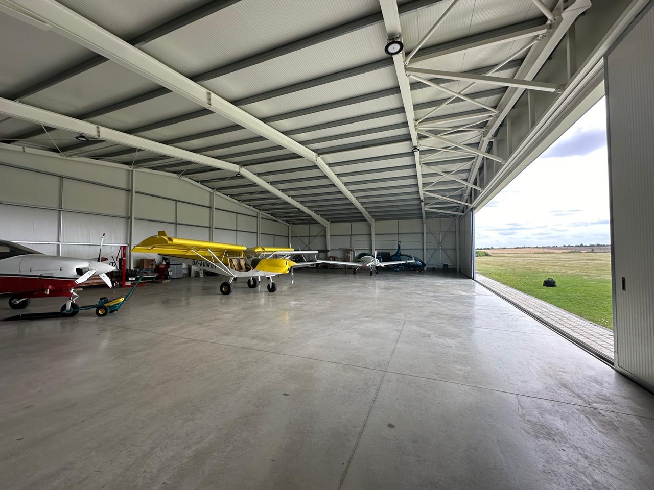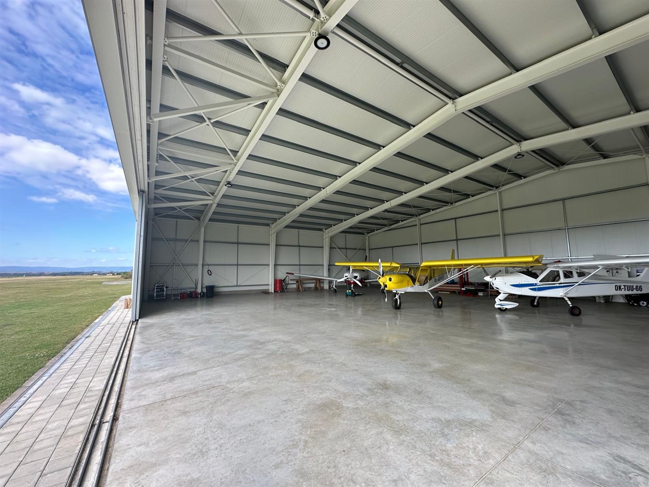 • Široký rozpon: Díky ocelové konstrukci dokážeme vytvořit prostor s velkou světlou šířkou, což je pro manipulaci s letadly klíčové.
