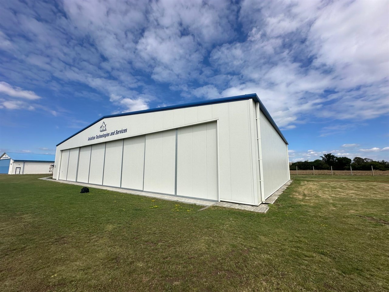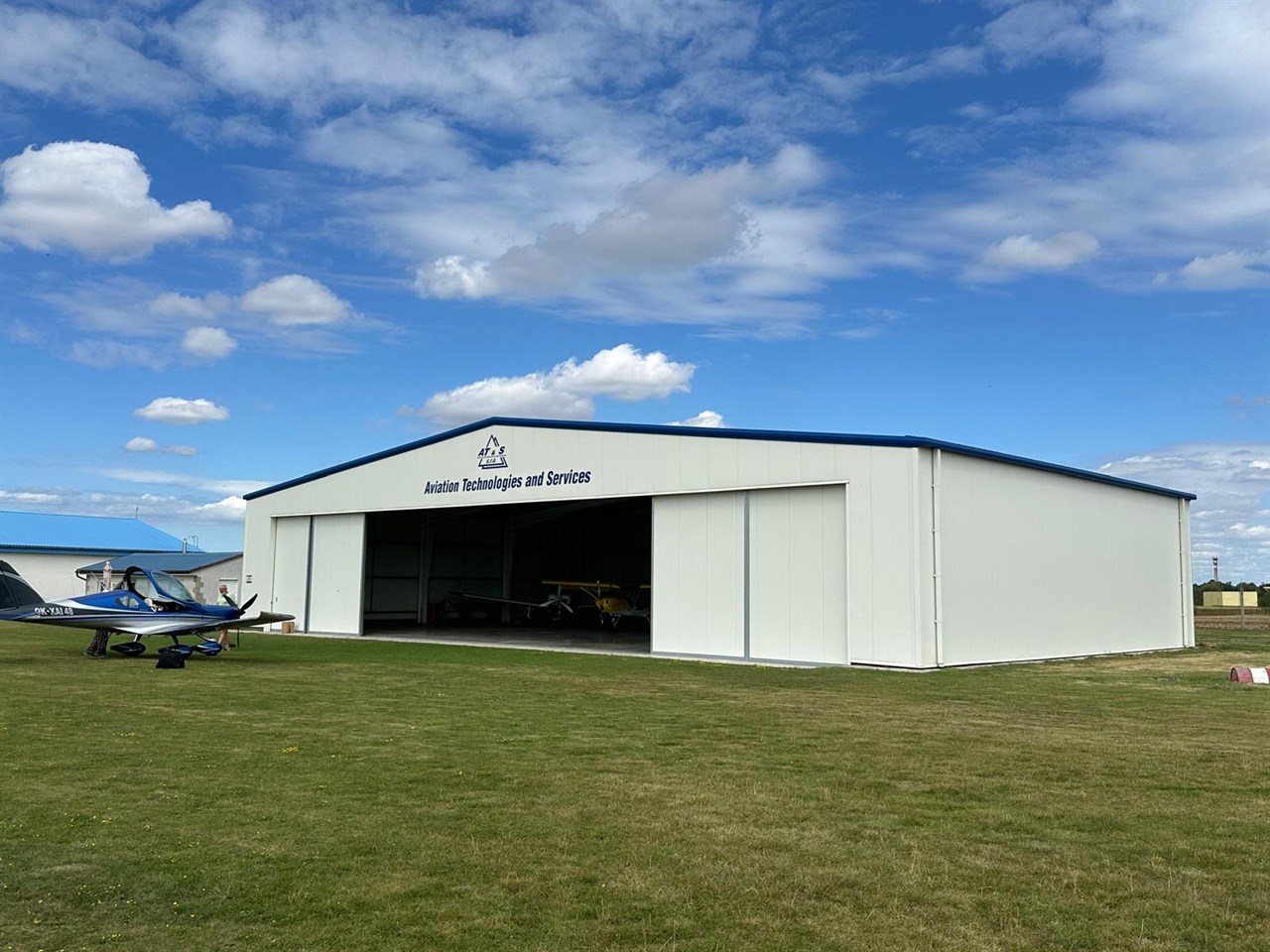 Tato výrazná modrá hala o rozměrech 25,44 x 40,50 x 5,02 m je důkazem, že moderní hangár může sloužit více účelům najednou. Kromě velkorysého parkovacího prostoru pro letadla s posuvnými vraty 20,60 x 3,00m a 14,00 x 5,00 m nabízí i komfortní ubytovací zařízení pro letce, což z ní činí kompletní základnu pro letecký provoz.